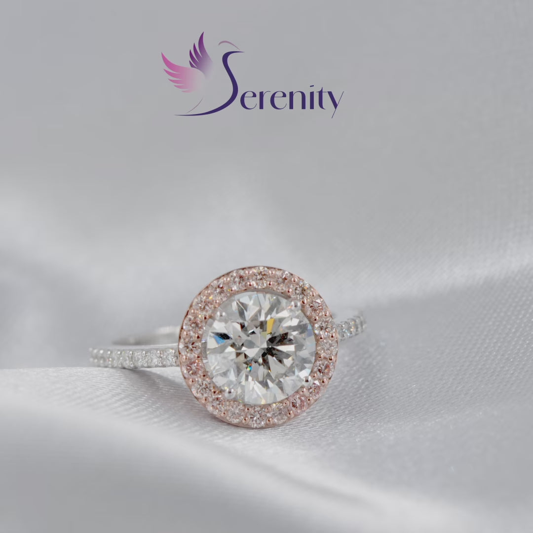 This elegant two-tone ring features a 2-carat round center diamond, surrounded by a halo of pink diamonds set in rose gold. The white gold band is accented with pavé-set diamonds, adding extra sparkle. A timeless and sophisticated design.